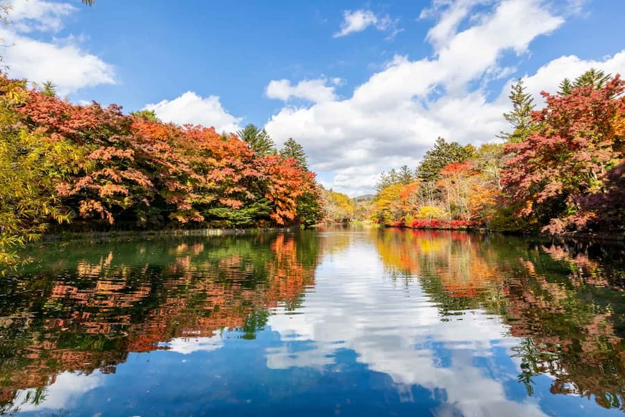「スワンレイク」とも呼ばれる雲場池は、四季折々の美しい風景が楽しめる散策スポット。特に秋の紅葉は見事で、水面に映る鮮やかな色彩が訪れる人々を魅了します。軽井沢駅からのアクセスも良く、自然の美しさを堪能できる癒しの場所です。